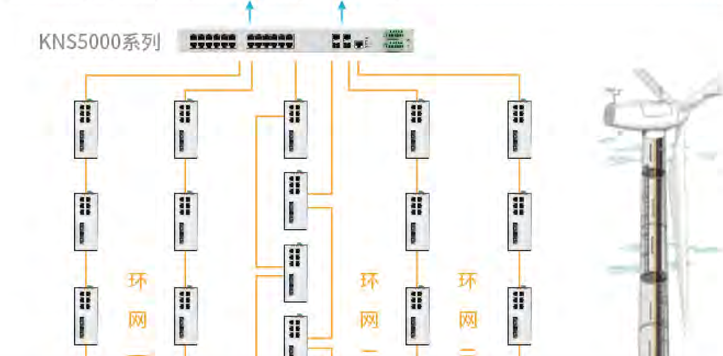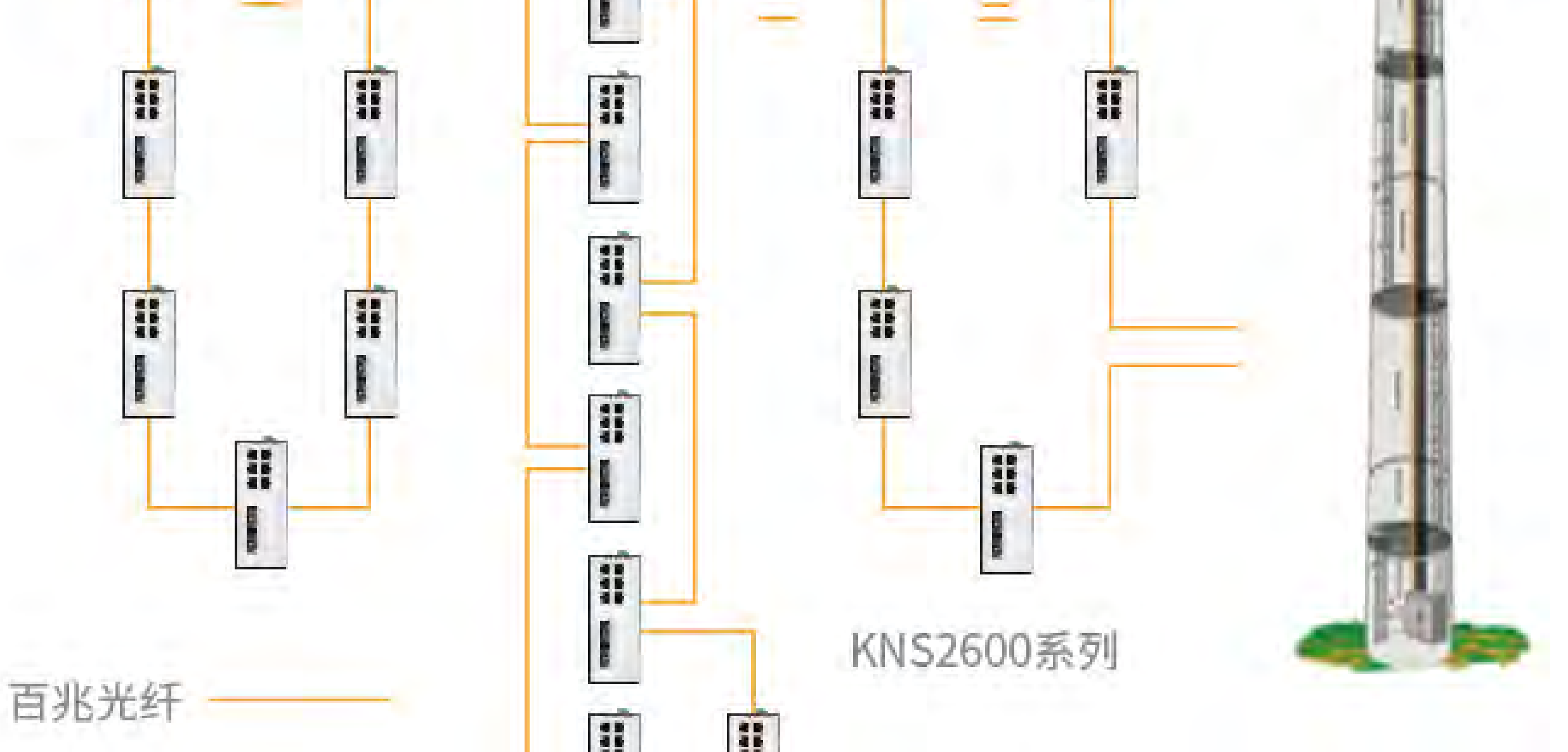 本方案共30台风机,组成三个冗余环网,在中心机房放笸KNSSOOO交换机,KNSSOOO通过光纤和每个环网内的KNS2600交换机组成百兆冗余环网,运行人员可在远方对风电场设备进行监测和控制,从而大大减少了现场维护的工作及。