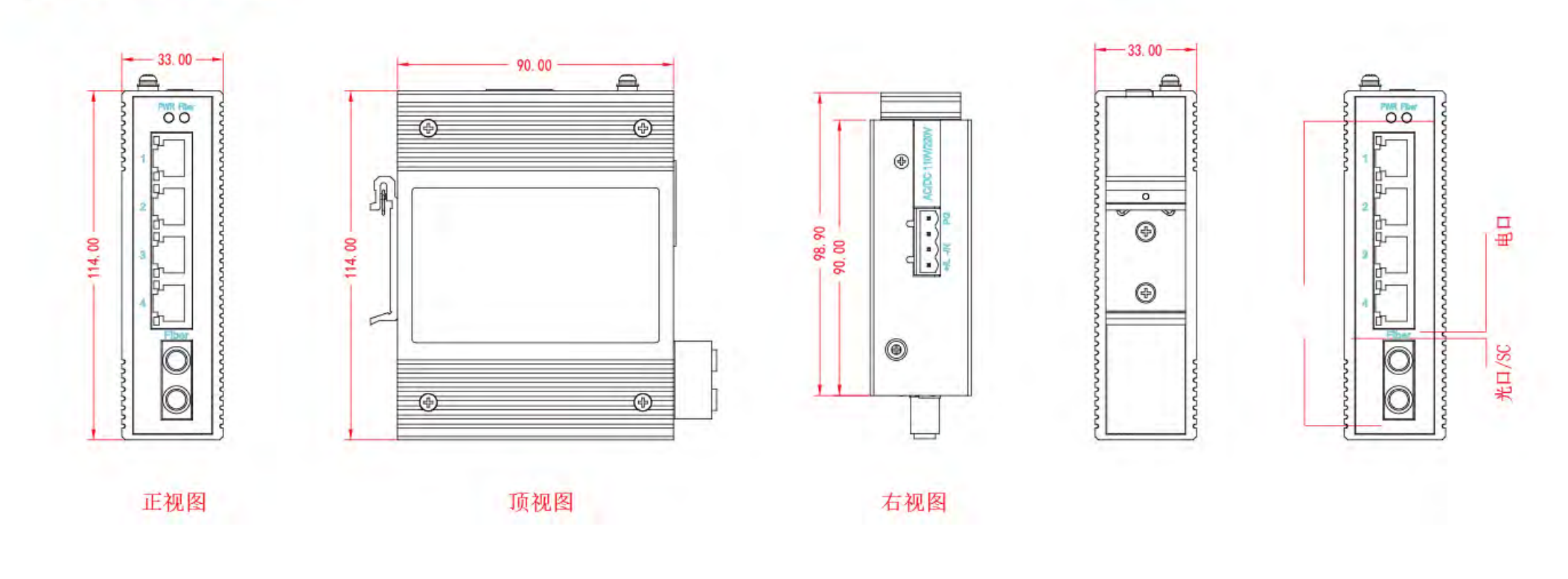 端口数量:支持4个电口、1个光口 光口:SC/ST/LC可选,单/多模可选 电口:10/100/lOOOBase-TX RJ45电口 | 工作电压:DC24/48V, AC /DC110/220V宽压范围 整机功耗:<5W@满载 电源保护:反接保护,过载保护 |