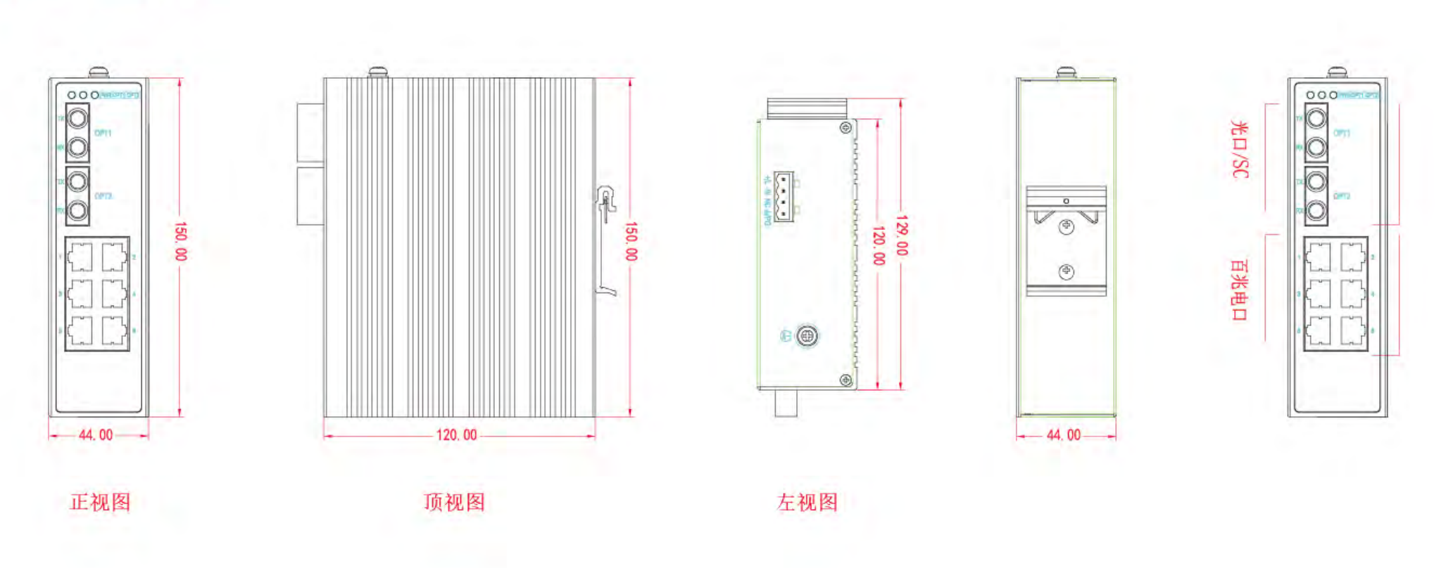 产品尺寸:44mm X 120mm X 150mm 机箱外壳:金属外壳 防护等级:IP40 安装方式:导轨/壁挂 | |